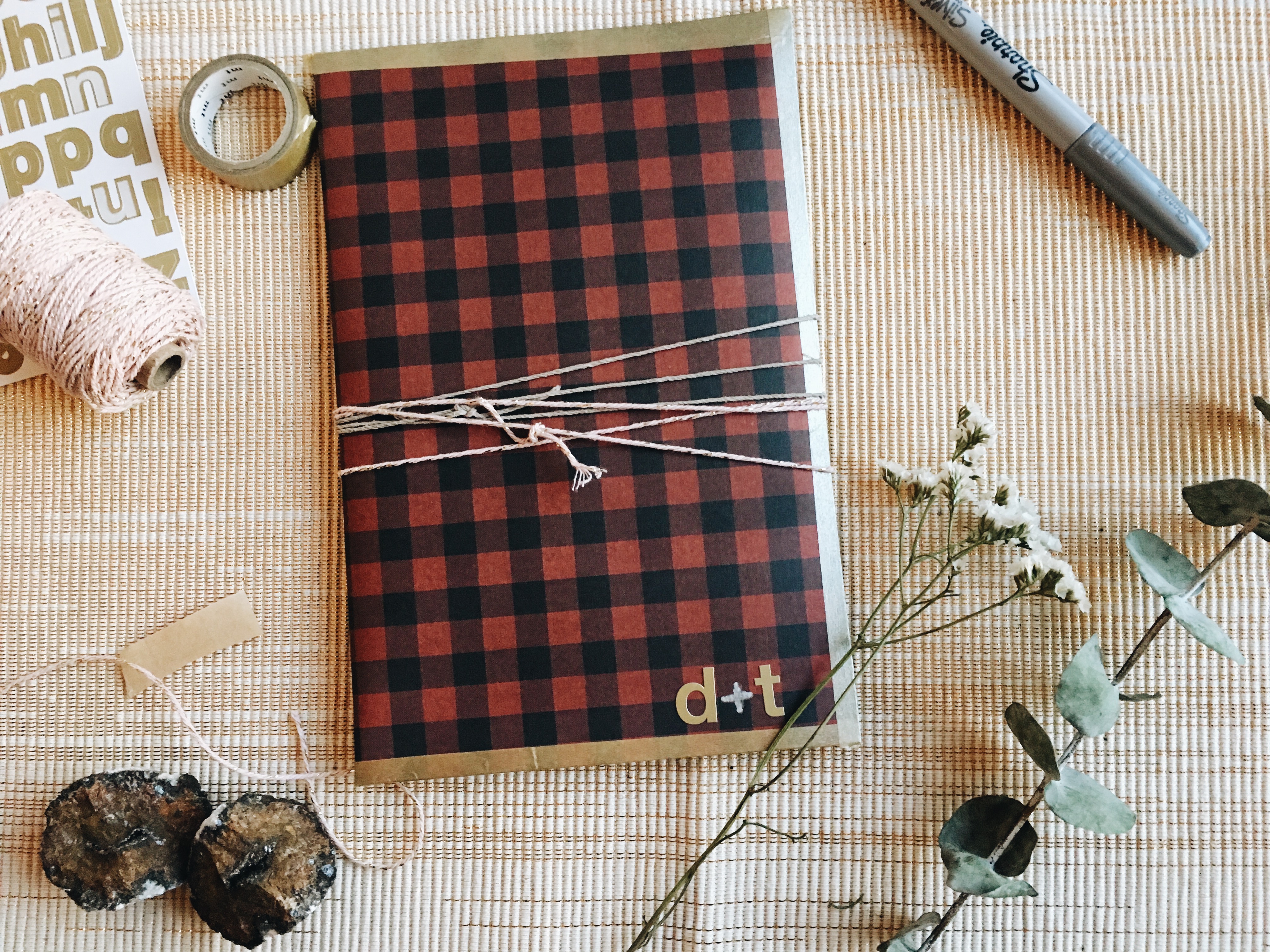 I took a piece of 8×11 plaid-patterned cardstock, from the ever-reliable A Beautiful Mess shop, and folded it in half. The Artifact Uprising book fit perfectly. I then taped the three open sides together with three pieces of gold washi tape (because the books aren’t particularly thick or heavy, one piece on each side suffices). Next, a couple of letter stickers in honor of the recipients, some beautiful twine from Amazon